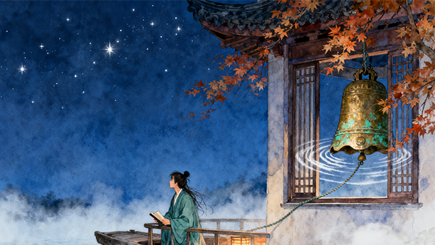 结尾“夜半钟声到客船”,以“钟声”收束全诗,将“愁绪”推向极致,余味悠长。“夜半”重申时间的幽深,此时万籁俱寂,唯有钟声响起;“钟声”是全诗最具穿透力的意象——寒山寺的钟声穿越夜色,飘到江上的客船,既写实钟声的悠远(听觉),更以“钟声的庄严”反衬“旅人的孤寂”:钟声是寺庙的“秩序与安稳”,而客船是“漂泊与无依”,一静一动、一稳一漂,对比间更显诗人的愁苦;同时,钟声也暗含“警醒”之意——在乱世中,这声钟声仿佛是对“无归宿”的叩问,让诗人的家国之忧、羁旅之思愈发浓烈。朗诵时需突出“钟声的穿透力”,气息绵长,“到客船”的“到”字尾音拉长,模拟钟声从远方飘来、萦绕不散的感觉,做到“声断情不断”,让愁苦之情随钟声一同,在夜色中久久回荡,留给读者无限的想象空间。
