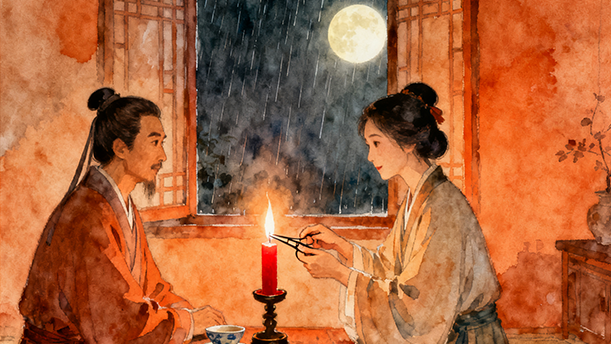 即便今日读来,每当我们与爱人、亲人相隔两地,在雨夜中想起“君问归期未有期”,在憧憬重逢时念及“何当共剪西窗烛”,依然会被这份跨越千年的深情击中。这便是《夜雨寄北》的魅力:它以最朴素的语言、最日常的细节,写尽了人类共通的“思念与期盼”,让每一个经历过分离的人,都能在诗中找到自己的影子,也找到对“重逢”最深的向往。