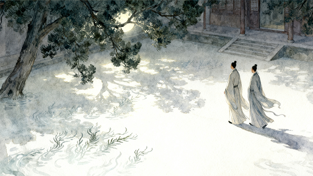 一、叙事:寻常琐事中的“闲”,藏着随遇而安的欣然 开篇“元丰六年十月十二日夜,解衣欲睡,月色入户,欣然起行。念无与为乐者,遂至承天寺寻张怀民。怀民亦未寝,相与步于中庭”,以日记式的平实笔触,记录夜游的缘起与过程,没有华丽辞藻,却处处透着“闲”的质感。 - “解衣欲睡”是日常的慵懒,“月色入户”是偶然的触动——月光本是寻常景致,却因“入户”的温柔,让苏轼瞬间抛却睡意,“欣然起行”的“欣然”二字,藏着他对自然之美的敏锐感知,即便身处贬谪,也未失对生活的热爱;“念无与为乐者”是独处的怅然,“遂至承天寺寻张怀民”是主动的寻觅——他不愿独享月色,便起身寻友,而“怀民亦未寝”的巧合,更添一份“知己难逢”的默契,两人“相与步于中庭”的从容,没有言语却胜过千言,尽显文人交往的清雅。 这一段叙事如流水般自然,没有刻意的抒情,却让“闲”的氛围悄然弥漫:不是“无事可做”的空虚,而是“能从平凡中寻乐”的通透。朗诵时需语气平实、语调平缓,“欣然起行”可带一丝轻快,“怀民亦未寝”读得温和,传递出“偶遇知己”的默契,避免过度渲染情绪,以“平淡”还原生活本真,让听众感受到“寻常小事中的诗意”。
