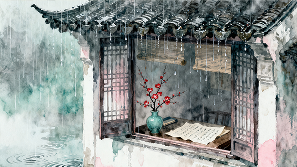 二、承转:“小楼一夜听春雨,深巷明朝卖杏花”——清雅中的怅然,藏着时光的虚耗 这两句是全诗最负盛名的写景之笔,看似写“春雨杏花”的清雅景致,实则藏着“客居无聊、时光虚耗”的怅然,将“落寞”从“直白抒怀”转为“景中藏情”。