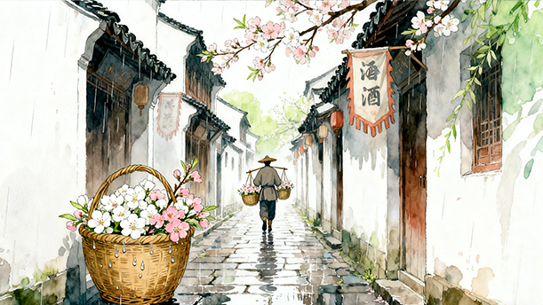 “深巷明朝卖杏花”则将视角从“小楼内”转向“深巷中”——次日清晨,幽深的小巷里传来卖杏花的吆喝声。“杏花”是春日的象征,代表生机与美好,但在诗人眼中,这份美好却透着“时光易逝”的怅然:春雨过后,杏花绽放,意味着又一个春天来临,而自己仍在临安客居,收复中原的理想却遥遥无期,“卖杏花”的吆喝声,像在提醒他“岁月蹉跎,壮志难酬”。