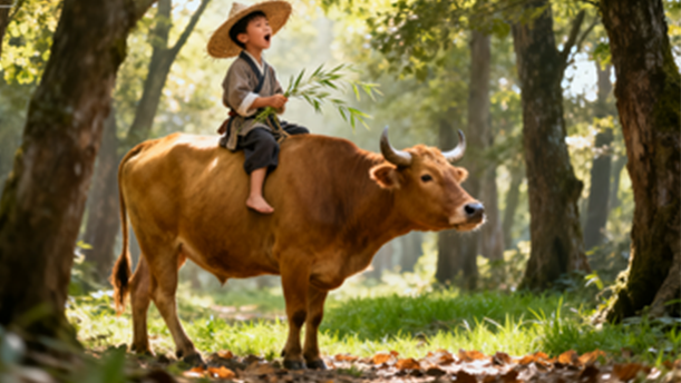 鉴赏:《所见》是清代诗人袁枚的一首童趣佳作,以简洁明快的笔触,勾勒出一幅充满野趣的牧童捕蝉图。 诗的前两句“牧童骑黄牛,歌声振林樾”,先描绘出牧童悠然骑在黄牛背上的画面,随即以“歌声振林樾”展现其天真烂漫——清脆的歌声在树林间回荡,将牧童的自在快活与山林的清幽融为一体,动静相宜,充满生活气息。 后两句“意欲捕鸣蝉,忽然闭口立”,是全诗的点睛之笔。牧童本在放声歌唱,可当他想要捕捉鸣叫的蝉时,瞬间收敛声音、静静伫立。