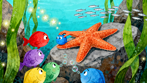 “有着五个脑袋的鱼!”小浪花们都笑了,他们又一起冲向海滩,他们都要亲亲那两条有着五个脑袋的小鱼。