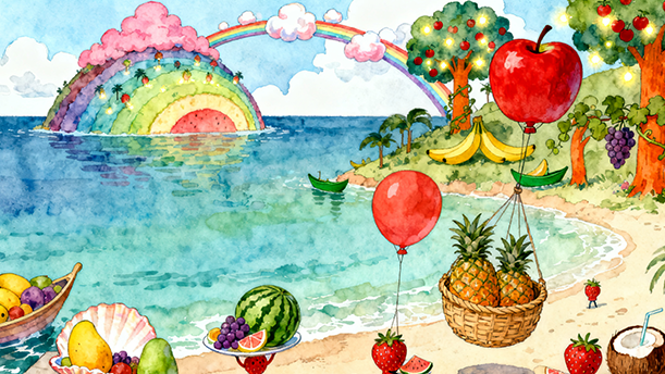 大大的、轻轻的水果气球,一会儿浮在海面上摇啊摇,一会儿被风吹着朝上飘啊飘。
