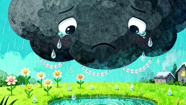 终于,风婆婆生气了,让乌云宝宝从袖子里掉了下来,变成了一滴滴小雨点。
