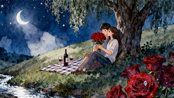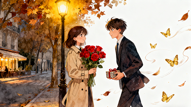 一只小熊站在路边,拿着三束红玫瑰。大哥哥和大姐姐手拉手走过来。