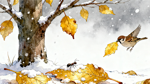 小毛虫吐出了一条细细的丝线,把叶子绕了一圈又一圈,金色的叶子渐渐变成了一个结实的茧,西风吹过树权,他牵起所有落叶的手,要带它们一起去远行。可他却小心地留下了那片裹着丝线的叶子,因为他知道,有一位“毛虫公主”正沉睡在里面——再过一百天,她就会展开金色的翅膀,和所有新长出的树叶一起,为春天翩翩起舞。