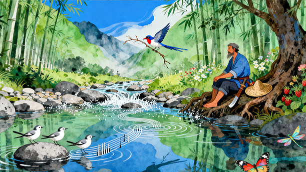这里有如大山的歌台,百鸟踊跃献艺。我或在芳草地里仰卧,或在岩石上倚立,或在溪岸边静坐,洗耳恭听这极为难得的空山鸟语,欣赏这拨人心弦的鸟之绝唱!