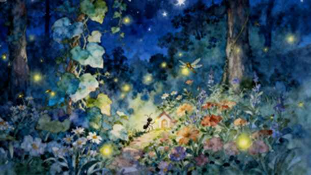 当小蚂蚁坚持要回家时,蜻蜓主动提出“送小蚂蚁”,萤火虫赶来“点亮小灯笼”,这一系列情节将互助的主题进一步深化。小蚂蚁坐上蜻蜓“飞机”、萤火虫在前照明的画面,充满童真想象;“飞过青青的假山,飞过绿绿的草坪”的场景描写,既串联起回家的路径,又勾勒出夏夜公园的美丽景致。 结尾处“星星高兴地眨着眼”与“多美的夏夜呀”的赞叹,将自然景物的灵动与故事的温情融合,点明“夏夜美”不仅在于景色,更在于互助带来的心灵美好。 全文语言简洁生动,对话富有生活气息,将睡莲、蜻蜓、萤火虫、小蚂蚁等形象刻画得鲜活可爱。通过小动物们的互助行为,自然传递出“互相帮助、助人为乐”的道理,既契合儿童的认知特点,又能在潜移默化中培养他们的友善品格,是一篇兼具审美价值与教育意义的佳作。
