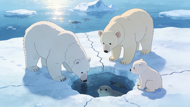 妈妈喜欢带着我们出去捕食海豹,妈妈说海豹是最有营养的食物,我和哥哥正在长身体,需要丰富的营养才能健康长大。但是这几天运气不太好,一直没有捉到海豹,全家人都有些饿,妈妈也没有太多耐心陪我们玩耍了。我跟在妈妈身后,一会儿在水里游泳,一会儿跳上岸,和哥哥打闹嬉笑着,心想有妈妈在,总会有好吃的,不用担心。