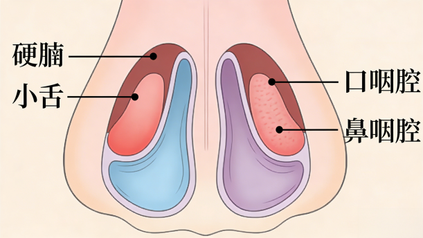 鼻腔位于口腔的上部,鼻腔下底部的硬腭如同一块天花板,天然地将口腔与鼻腔隔成“小阁楼”的“一层”和“二层”。一、二层楼之间的联系由一扇活动的“小门儿”控制,这扇小门儿便是可以挺直或垂下的小舌,它随软腭的升降实现口咽腔、鼻咽腔的切断与对接,决定着口音和鼻音的性质。