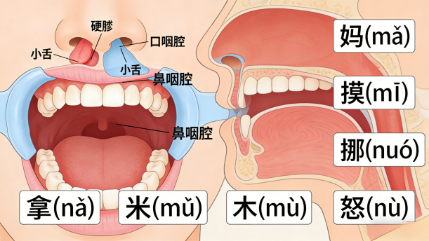 通过鼻音声母发音练习,使学生感知鼻音m、n的发音位置以及气流是如何从口腔转换到鼻腔的。
