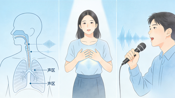 人的声音大致分为高、中、低三个声区,不同声区使用的共鸣腔是不一样的。发低音时使用的是胸腔声区,以胸腔共鸣为主,口腔次之,头腔更次;发中音时使用的是混声区,共鸣以口咽腔为主,头腔次之,胸腔更次;发高音时是头声区,以头腔为主要共鸣区,口咽腔次之,胸腔更次。