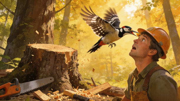 山下传来走路的声音,一个人拿着斧头走进树林,打量着一棵又一棵宽厚雄壮的树,鸟儿们吓坏了,匆忙地从树枝上飞走,失望地喊叫着,林中的和谐一下子就被打破了。突然,那个人停下了脚步,欣喜地望着一棵又大又粗的树,“哈哈!这么大的树,砍掉去卖钱准能赚一大笔!”他从口中拿出一盒烟,抽出一根,放入嘴中点燃,抽烟可以给他带来干劲。“就这一棵了!”他抡起斧子,使劲向树挥去,“啊!好痛啊!”大树绝望地哭喊着,它的身上被砍出了一条裂口,树汁从伤口中涌出。一只啄木鸟闻声飞来,停在了这个人的头上,用尖长的细嘴去啄这个人的脑袋,说道:“这段木头中一定有虫。”这个人完全不知情,继续砍伐大树。小花小草们耷拉着脑袋,怯生生地望着即将倒下的大树,它们害怕极了。“轰”的一声,树林中发出一声闷响,震彻山谷,吓得停在那个人脑袋上的啄木鸟飞走了。树失去了它的生命,倒在了地上。那个人擦了擦额头上的汗,看着那棵已经倒下的大树,笑了,这种笑,不怀好意。