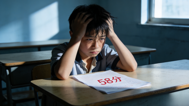 没几天,考卷发了下来,教室里沸沸扬扬的,同学们都考了97、98、100等高分,他们正喜笑颜开地互报自己的分数,只有贪玩误己的小明考了53分,老师在班上严厉地批评了他,小明的心情一落千丈,闷闷不乐地看着考卷发呆······