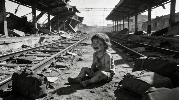 “哇——爸爸妈妈,你们在哪里?”一阵凄惨的哭声在火车站上空传开来。原来,是那个孩子!只见他的身体上伤痕累累,红肚兜早已不知去向。他惊恐万分地望望四周:只见四周尽是倒塌的房屋,炸碎的火车,断裂的铁轨,周围尸横遍野、血流成河,似乎经历了一场千年长战。他撕心裂肺地哭着:“妈妈,你在哪里?妈妈,我好害怕!”