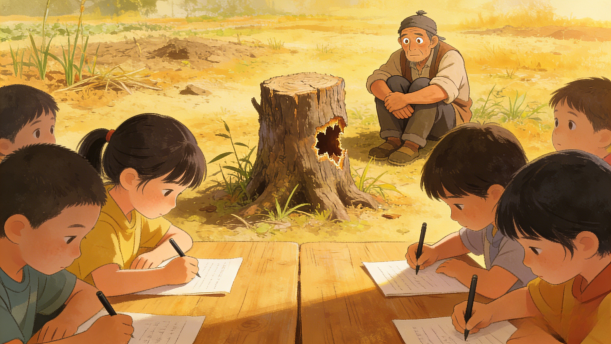 从此他丢下锄头,整天坐在树桩旁边等着,看有没有野兔再跑过来撞死在树桩上。日子一天一天过去了,再也没有野兔来过,他的田里已经长满了野草,庄稼全完了。