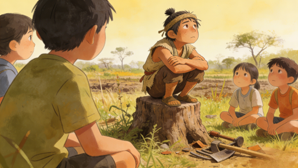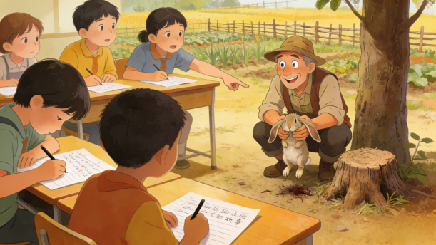 古时候有个种田人。一天,他在田里干活,忽然看见一只野兔从树林里窜出来。不知怎么的,它一头撞在田边的树桩上,死了。