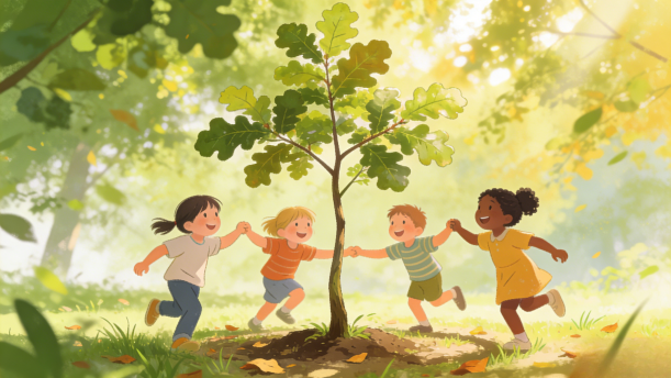 幼小的橡树长出第一批嫩叶,又把枝条向四处伸延,转眼之间填补了你留下的空间。茁壮的幼苗变成参天大树,孩子们又会在它的树荫下嬉笑、玩耍,成年人又会在那里歇息、畅想。
