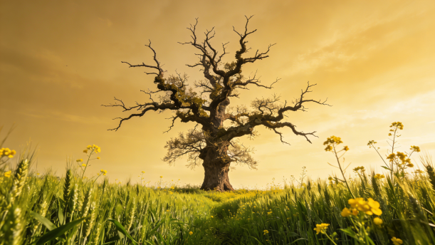 只有一棵橡树默默地站在一旁。它没有穿上新装,它那饱经沧桑、满是皱纹的老皮一丝不挂地袒露着;它雄伟、挺拔、巍然屹立,干枯的树枝直指天穹,犹如高举双臂,祈求上帝的怜悯。可是它的血液已经凝滞,生命的火花已经消失,严酷的寒冬结束了它的残生。