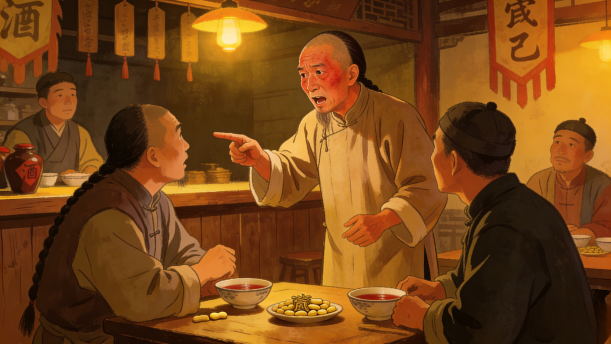 “你一定又偷了人家的东西了!”孔乙己睁大眼睛说,“你怎么这样凭空污人清白······”“什么清白?我前天亲眼见你偷了何家的书,吊着打。”孔乙己便涨红了脸,额上的青筋条条绽出,争辩道,“窃书不能算偷······窃书!······读书人的事,能算偷么?”接连便是难懂的话,什么“君子固穷”,什么“者乎”之类,引得众人都哄笑起来:店内外充满了快活的空气。