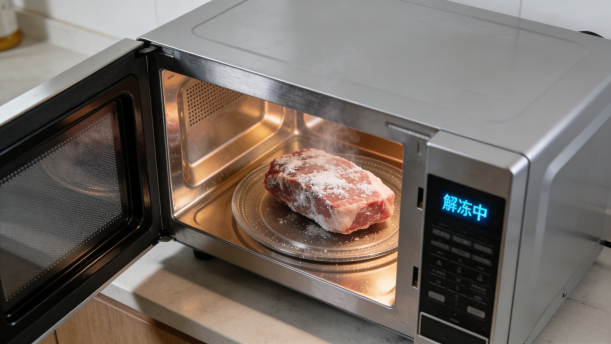 第二个是“解冻开关”,冰箱里的肉要炒着吃,可一时又不能解冻,怎么办?这你不用着急,微波炉自会替你解决难题。只要把肉放到盘中,放进微波炉,拧一下“解冻开关”,不到三分钟,肉上的一层薄冰自然融化,刚才硬梆梆的肉经过微波炉的魔法,一下子就变得软软的了。