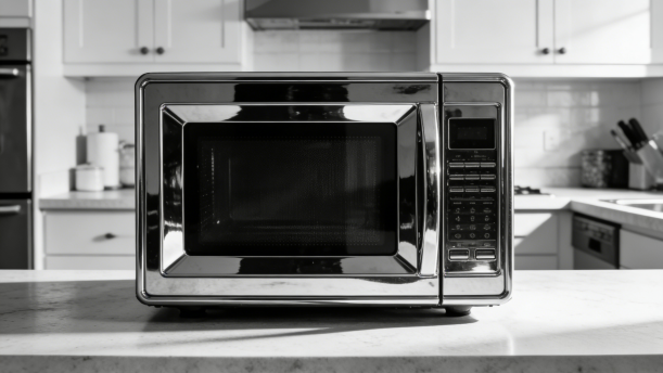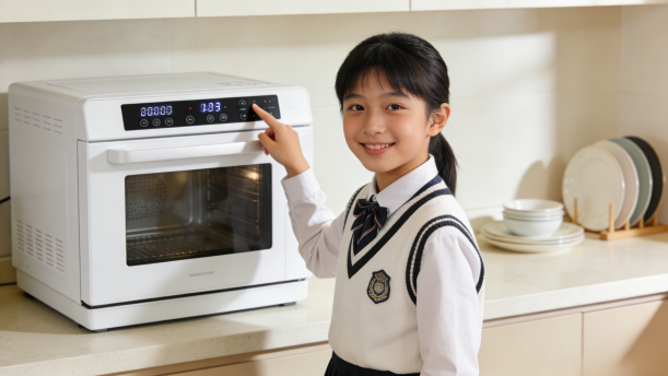 我们家的微波炉是四四方方的。外层黑白相间,既大方又实用。炉子左、右两边都装有“排气口”,可以把炉里的蒸气散出来。炉子里边还有一个小圆盘,是专供烹调用的。需要烹调的食物,往圆盘上一放,拧下开关,它便开始运行了。
