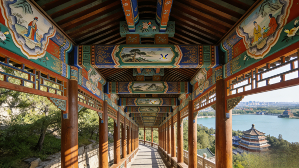 进了颐和园的大门,绕过大殿,请看,这就是有名的长廊。它东起邀月门,西至石丈亭,全长728米,共273间。长廊是我国园林中最长的游廊,也称画廊。因为廊中有很多的彩绘,小朋友猜猜,有多少幅?多达14000余幅,而且很少有重复。其中有关于西湖风光的就有546幅,是乾隆十五年建造长廊时,命人到杭州临摹后画上去的。人物画多出自我国的古典文学名著,例如《西游记》《三国演义》《红楼梦》等,所涉及的内容时间跨度很大,从三皇五帝到清朝,这些画面可以说是我国文化史的一个缩影。这里被《吉尼斯世界纪录大全》评为全球画廊之冠。