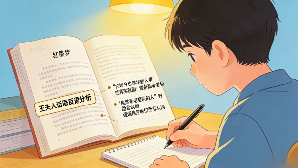 上面语段节选自《红楼梦》第三回《林黛玉进贾府》。在这节训练中,请学生分析段落中包含的反语性内在语,结合上下文语境,从语气上体会王夫人与贾宝玉之间亲密无间的情感和表现出的生活情趣。声音上要松弛平缓,灵活多变,不可太过生硬。