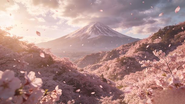 樱花在日本文化中有着举足轻重的地位,被誉为“国花”。每年春季,从南到北,樱花由温暖的冲绳逐渐向寒冷的北海道次第开放,形成一条壮观的“樱花前线”,吸引着无数日本人与海外游客追逐花期。樱花的花期通常只有一周左右,短暂而绚烂,这种“刹那芳华”的特质,也深深影响了日本人的审美与生死观,他们欣赏樱花盛开时的热烈奔放,也坦然接受其凋零时的凄美决绝,认为这是一种生命轮回的自然体现。在富士山前这片樱花海中,粉白、淡红的樱花层层叠叠,如云似霞,微风拂过,花瓣簌簌飘落,宛如一场浪漫的“樱花雨”。