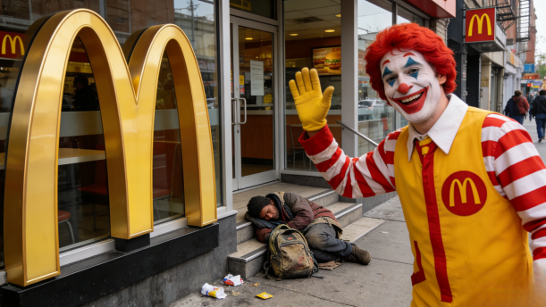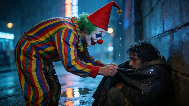 示例:那是一个深秋的傍晚,寒风卷着落叶,在麦当劳暖黄的灯光外打着旋。小丑罗比像往常一样,穿着鲜艳的红白条纹服,脸上画着大大的笑脸,站在店门口热情地向每一个路过的人挥手,逗得孩子们咯咯直笑。然而,他眼角的余光却总是不由自主地瞟向门口右侧的台阶——那里,一个衣衫褴褛的男人蜷缩在破旧的毯子下,似乎已经睡着了,对身边的喧嚣充耳不闻。