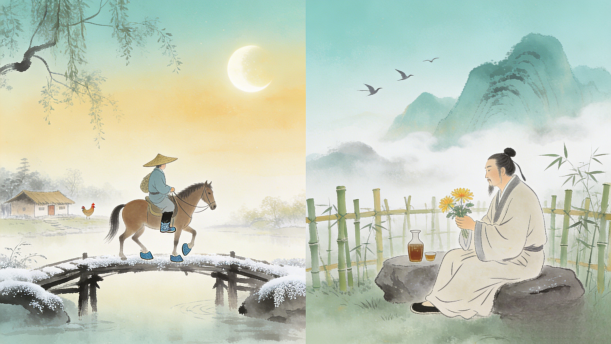 “鸡声茅店月,人迹板桥霜。”这一句写诗人初离驿站之所见,通过一词一景的层叠渲染,为我们描摹了一幅凄清有致的霜晨早行图。同时,“晨起”“客行”更是将诗人内心寝不安眠、愁苦思乡,孤旅天涯、凄清孤冷的痛楚淋漓尽致地展现出来,一个思乡游子的形象跃然纸上。这里的“悲客思乡”“凄清孤冷”就是我们所寻找的意境回味性内在语。只有找准了意境回味性内在语,我们才能更细腻地鉴赏,更准确地表达。