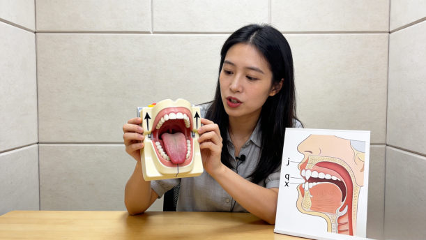 发舌面阻音j、q、x时将舌头平放,舌尖抵下齿背,由舌面前部主动与硬腭前部接触或接近使气流受到阻碍。发音时阻气着力点在舌面前部与前硬腭处。
