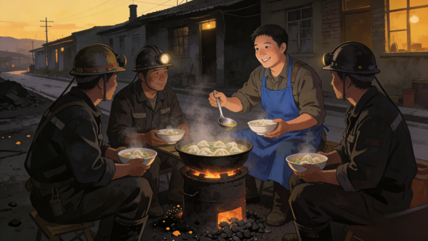 直至有一天,队长刨煤时被哑炮炸成重伤。弥留之际,他对妻子说:“我死之后,你一定要接替我每天去吃一碗馄饨。这是我们队12个兄弟的约定,自己的兄弟死了,他的老婆孩子,咱们一定得帮。”