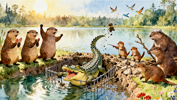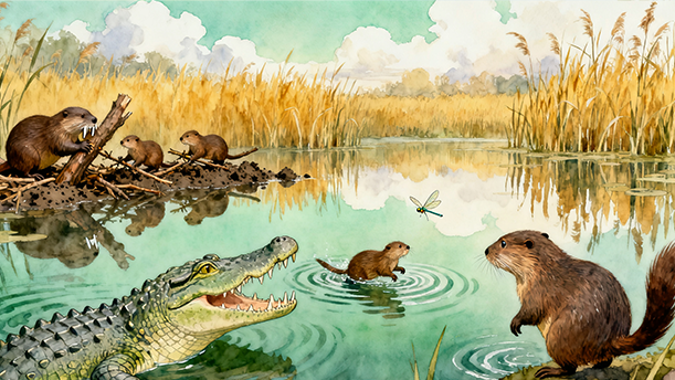 一天,河狸请来许多朋友参观自己的新居,其中混进了一条鳄鱼。鳄鱼在参观时,看到河狸身体胖胖的,浑身都是肉,馋得口水直流。