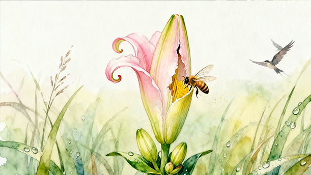 在野草和蜂蝶的部夷嘲笑下,百合努力地生长着。终于有一天,它开花了。