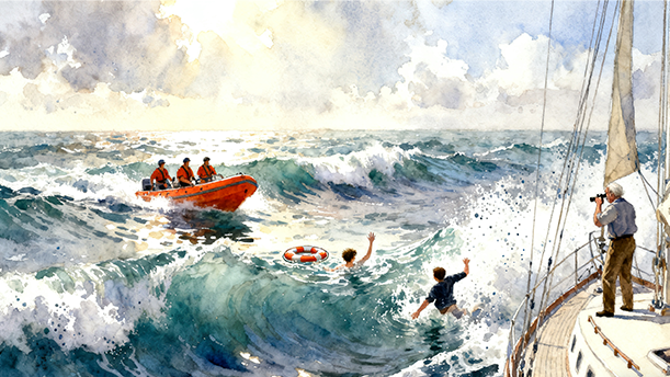 “扑通”一声,孩子像颗炮弹扎进了海里。二十来个勇敢的水手已经跳进了大海:40秒钟——大家已经觉得时间太长。等孩子一浮上来,水手们就立刻抓住了他,把他救上了甲板。