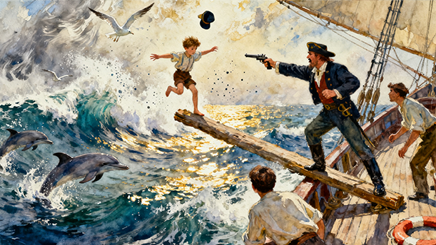他本来是想打海鸥的,看见儿子在桅杆顶端的横木上,就立刻瞄准儿子,同时喊:“向海里跳!快!不跳我就开枪了!”小孩心惊胆战,站在横木上摇摇晃晃的,没听明白爸爸的话。船长又喊:“向海里跳!不然我就开枪了!一!二!”刚喊出“三!”孩子往下一纵身,从横木上跳了下来。