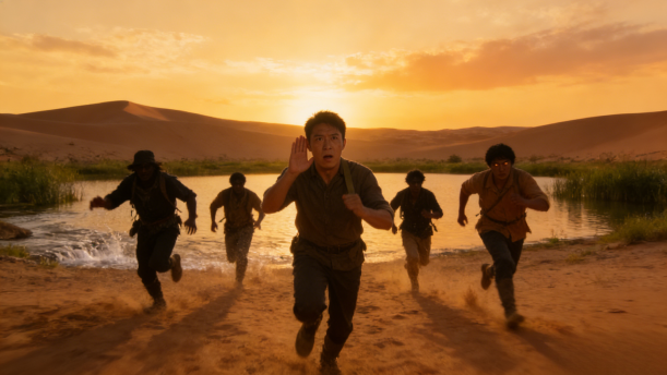 果然,左边那高高的沙丘下出现一个绿洲。大家发疯似地涌向湖边·····