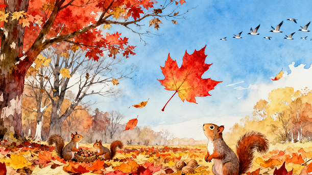 听到风儿的热情邀请,树叶们一片,一片,又一片,纷纷地朝大地飞去。