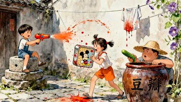 “干什么?”马老师不愿意等,“砰”地冲进来。近视眼小猪已经射击,“滋”一大滩西红柿汁水射得马老师一头一脸。