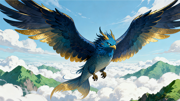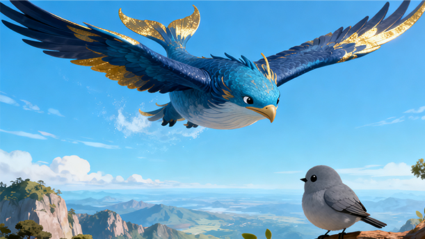 这条大鱼的名字就叫做鲲。有一天,这条大鱼变作了一只鸟,也同样是大得不可思议。这只鸟的脊背有泰山那样高大,双翅一展,就像是挂在天空的云彩遮住了半个天空,这只鸟名叫鹏。