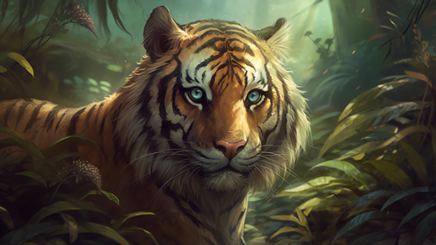 在茂密的森林里,有一只老虎正在寻找食物。一只狐狸从老虎身边窜过。老虎扑过去,把狐狸逮住了。