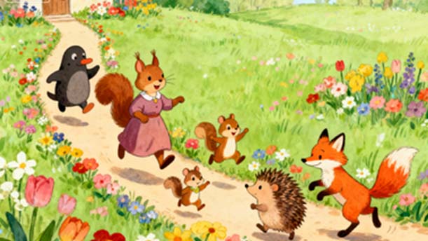 鼹鼠先生来到松鼠太太门前。松鼠太太走出门,看见门前的小路上花朵簇簇,小松鼠、小刺猬和小狐狸在那里快活地蹦啊跳啊。