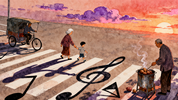 这是一首充满想象力的小诗。小诗第1、2、3小节运用排比的手法,将运动着的斑马比作流动的小河、流动的花朵,化抽象为具象,富有想象力,呼应标题《斑马线》。朗诵时,也要化虚为实,着重画面感,将斑马线一条条铺开的过程展示出来,这是城市建设的缩影,也是孩子美好的形容,排比的段落逐渐加强语气,逐层深入,最后一节升华。