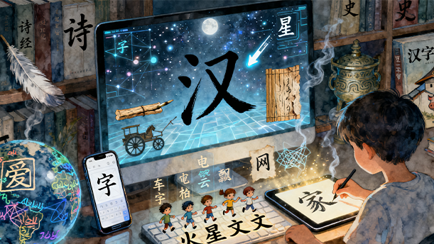 诗歌第1小节是老师用粉笔写下的汉字。“叽叽吱吱钻出来的时候”,体会形象的动作感,可以想象为一群小音符争着向外挤,“四平八稳横平竖直”语速较慢。第2小节是同学们写下的汉字,他们爱上汉字并且爱上由汉字体现出的祖国文化。“越来越大得无尽头”要有扩大延伸感。“身前身后”要有一种大幕开启的感觉,介绍汉字的历史。诗歌第3小节,想象自己就站在青铜器前,在观赏,在赞叹。第4小节注意“狂草”“龙飞凤舞”“行云流水”的对比。