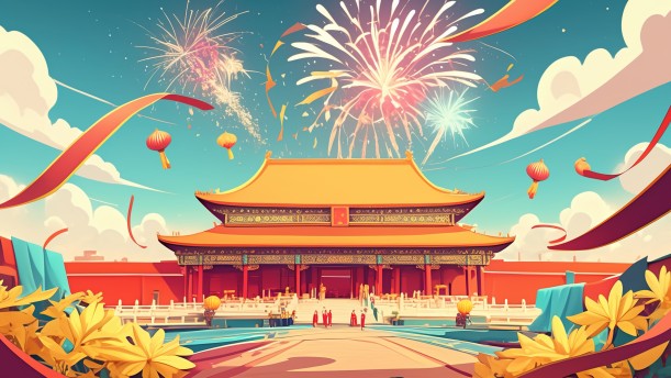 白鸽飞翔,红旗招展,和煦的阳光倾洒人间
