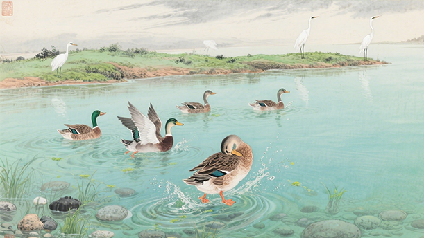 “春江水暖鸭先知”是全诗的“诗眼”,也是从“画内景”到“画外意”的升华。画中或许能见到春江与游鸭,却无法直接呈现“水暖”的触感,而苏轼以丰富的联想,将鸭子的游动与“水暖”的感知关联——鸭子常年浮于水面,对水温变化最为敏感,它们的嬉戏游弋,便是春天到来、江水回暖的最直观信号。这一句既贴合生活常理,又充满灵动的意趣,让静态的画面有了动态的感知,“先知”二字更赋予鸭子几分“灵性”,仿佛它们是早春的信使,悄悄传递着春天的讯息,也让诗人对春的喜悦之情自然流露。