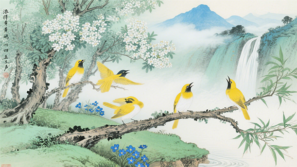 结尾“添得黄鹂四五声”,以声衬静,为宁静的山行添了几分灵动生机。若说“绿阴不减”是视觉上的静谧,“黄鹂四五声”则是听觉上的惊喜——山间本是幽静,偶尔传来几声黄鹂清脆的鸣叫,非但不喧闹,反而更显山林的清幽;“四五声”的数量描写也极妙,不多不少,恰是“偶尔听闻”的惬意,既打破了单调,又不破坏宁静,如点睛之笔,让整个山行画面瞬间鲜活起来。朗诵时延续明快基调,只需稍作停顿,便能让黄鹂的鸣声在“绿阴”的静谧中凸显,传递出诗人偶遇生机的轻松愉悦。