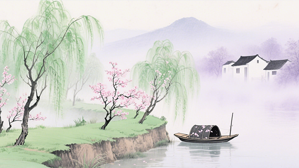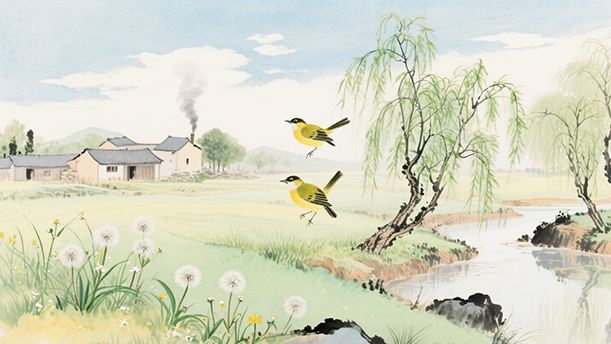 “拂堤杨柳醉春烟”,将视角聚焦于河岸堤边,把春日的柔美写得淋漓尽致。“拂堤”二字赋予杨柳以灵动姿态——柳条细长柔软,随风轻摆,仿佛在轻轻抚摸堤岸,充满拟人化的温柔;“醉春烟”更是神来之笔,“春烟”指春日清晨或傍晚的薄雾,朦胧轻盈,而杨柳仿佛被这春日薄雾与生机熏得“醉”了,姿态慵懒、摇曳生姿。这一句从“动态的活”转向“静态的柔”,与前句的“草长莺飞”形成动静互补,既写出春日的明媚,又透出乡村的静谧,让整个春景既有活力又不失温婉。